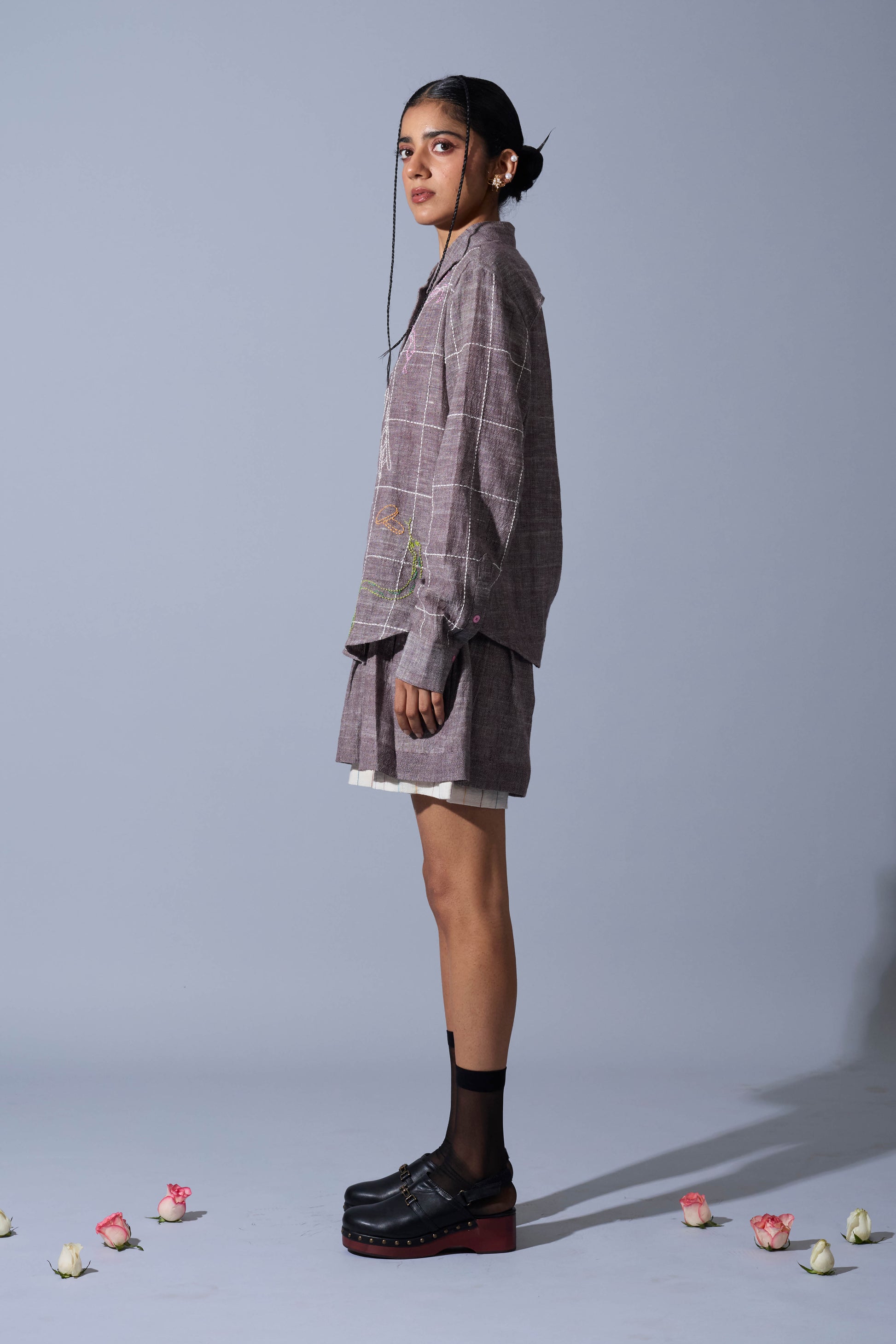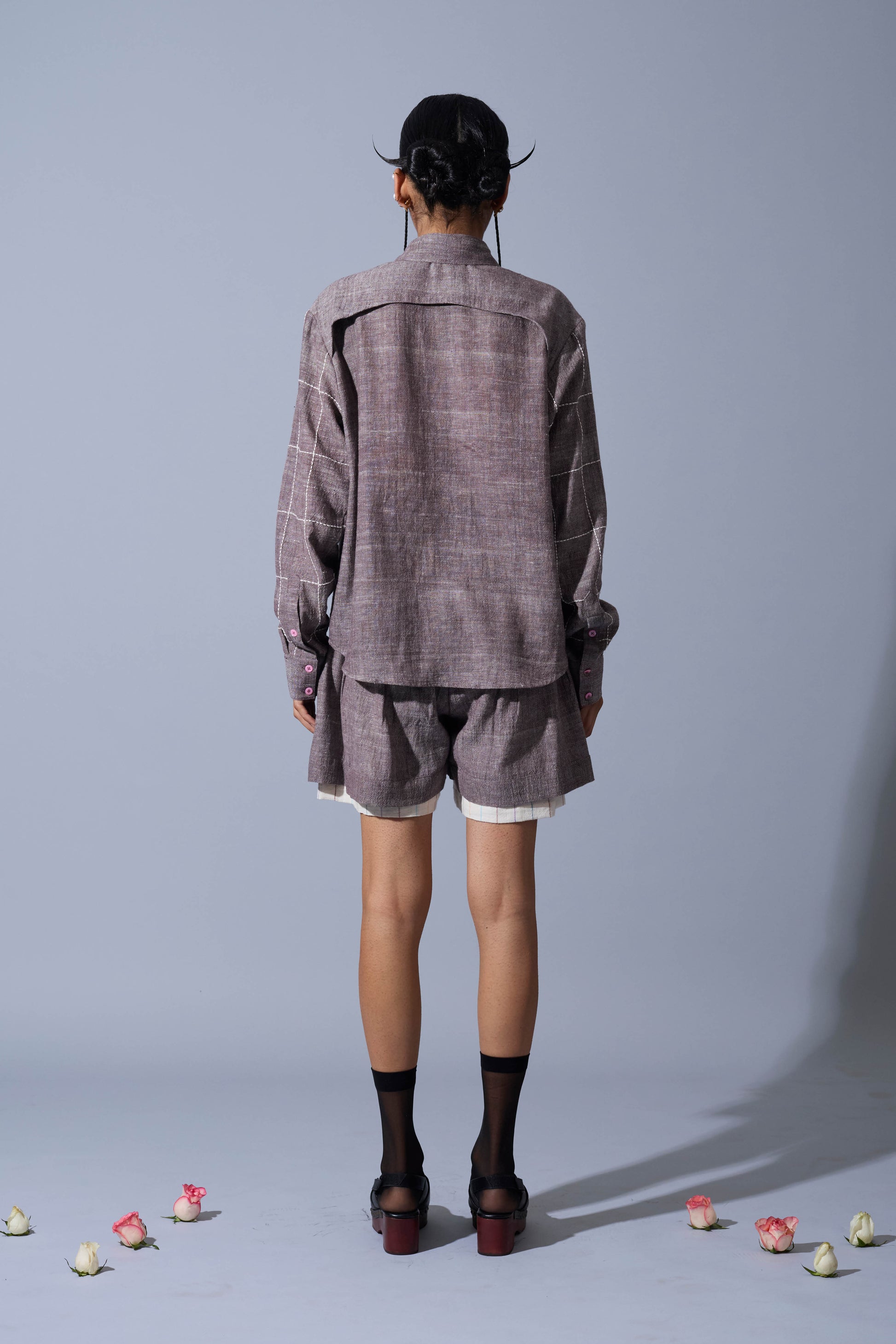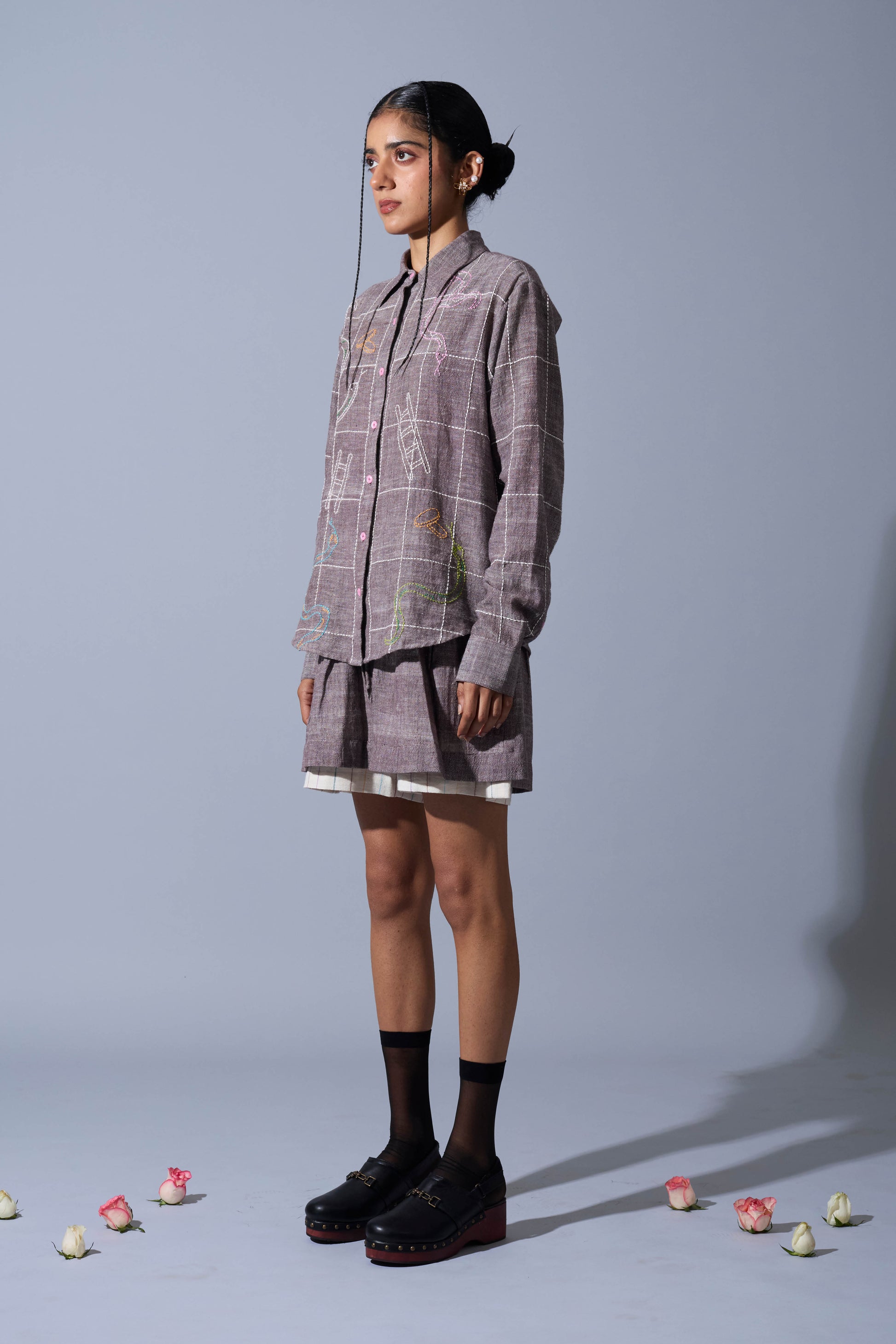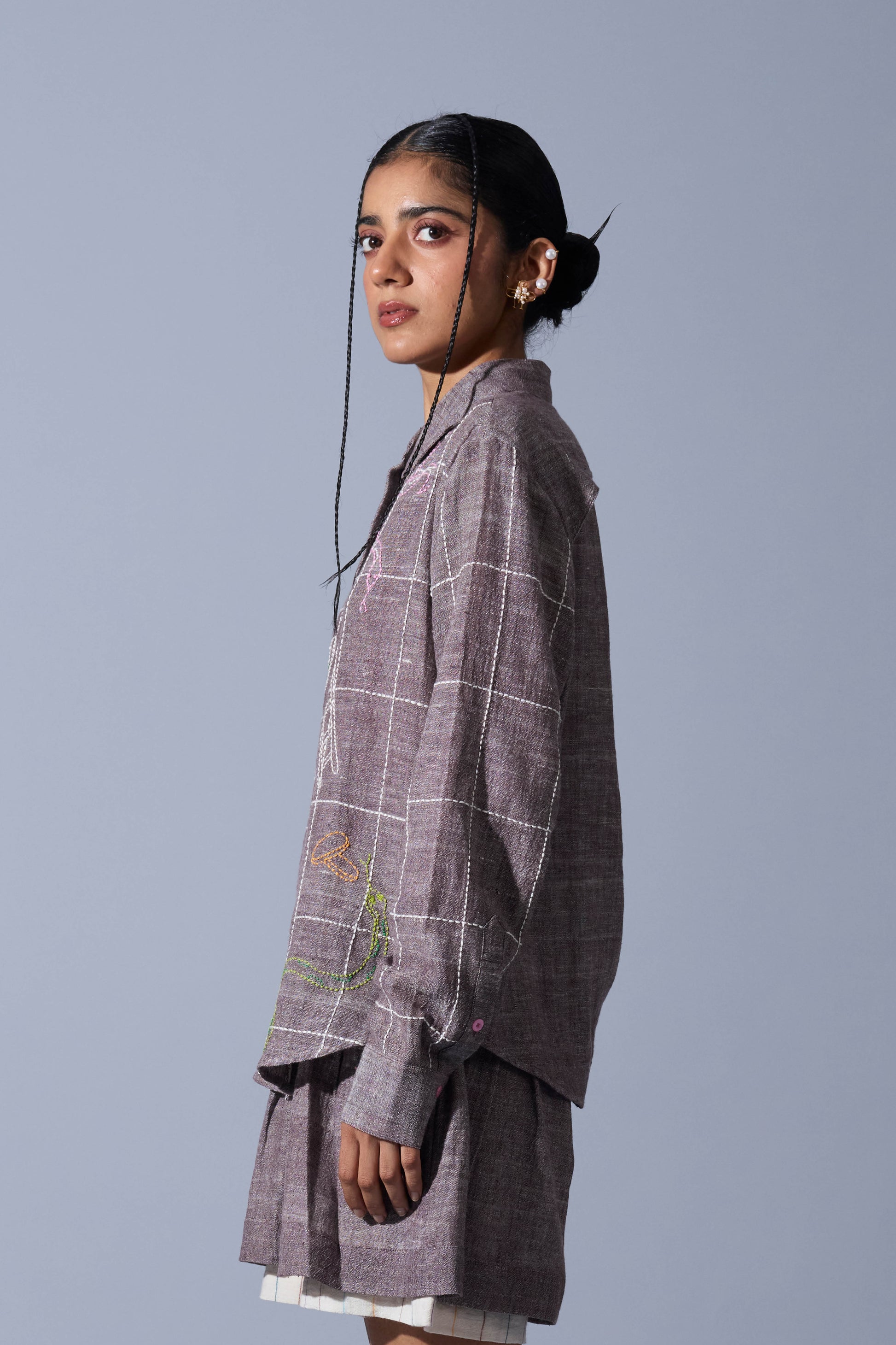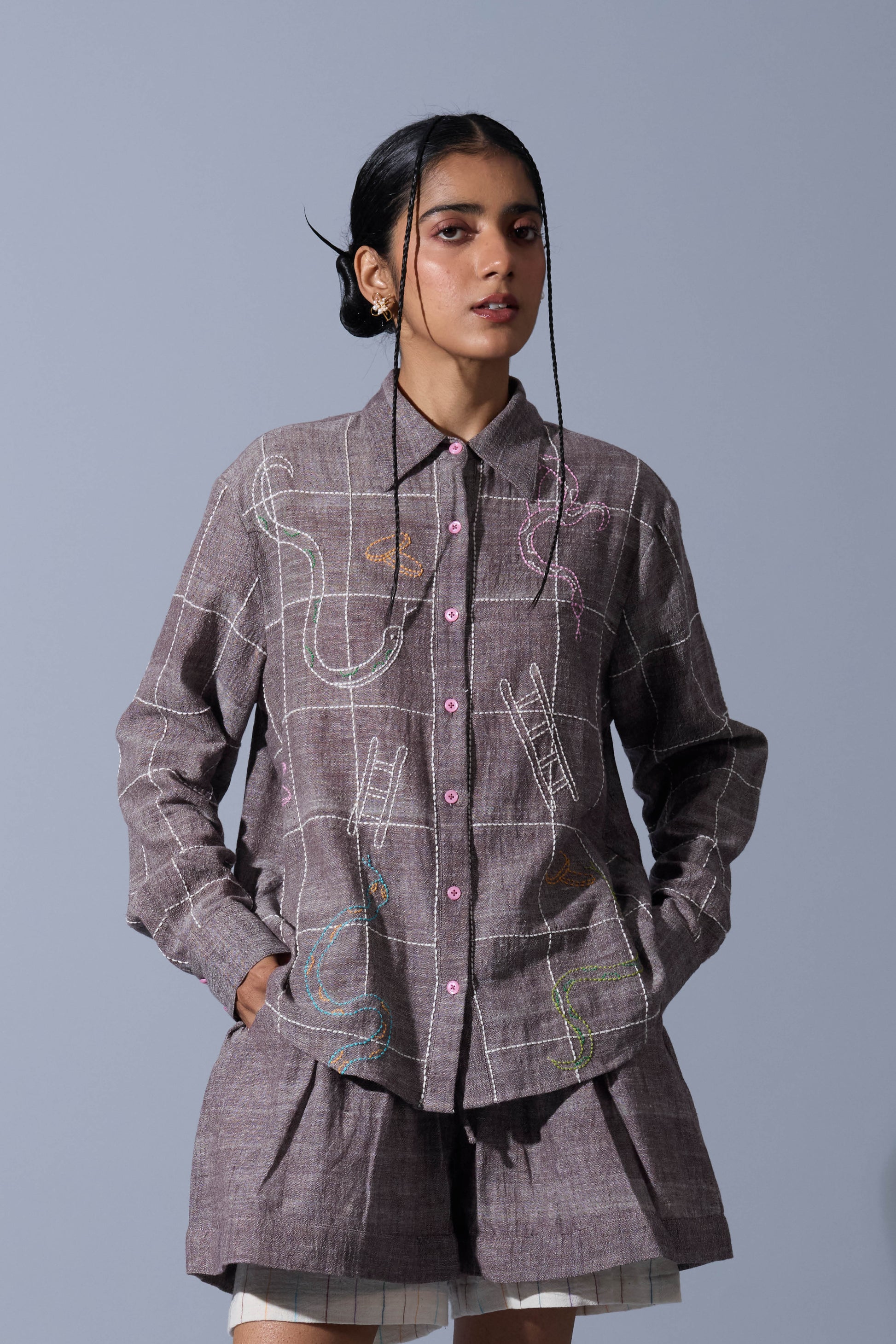 A handwoven linen shirt featuring intricate hand-embroidered checkerboard detailing at the front.