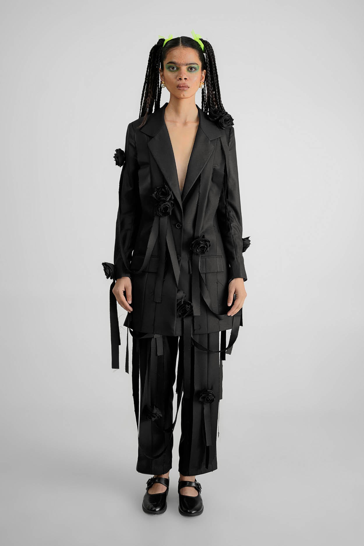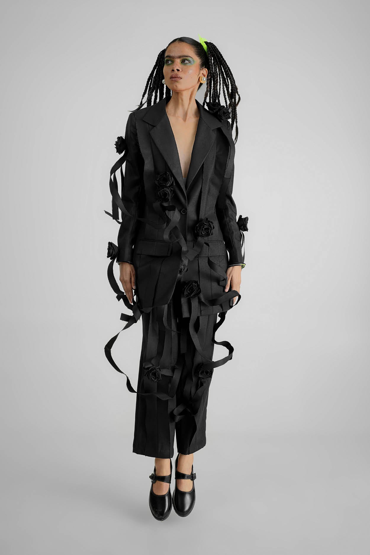 A fine suiting relaxed fit pant with hand applique flower and string work in signature QUOD style using upcycled fabric.