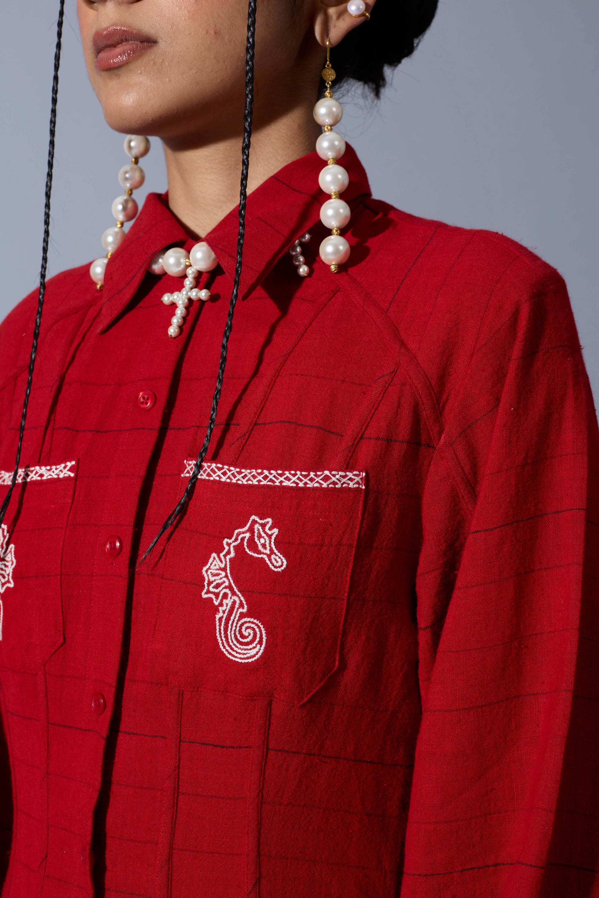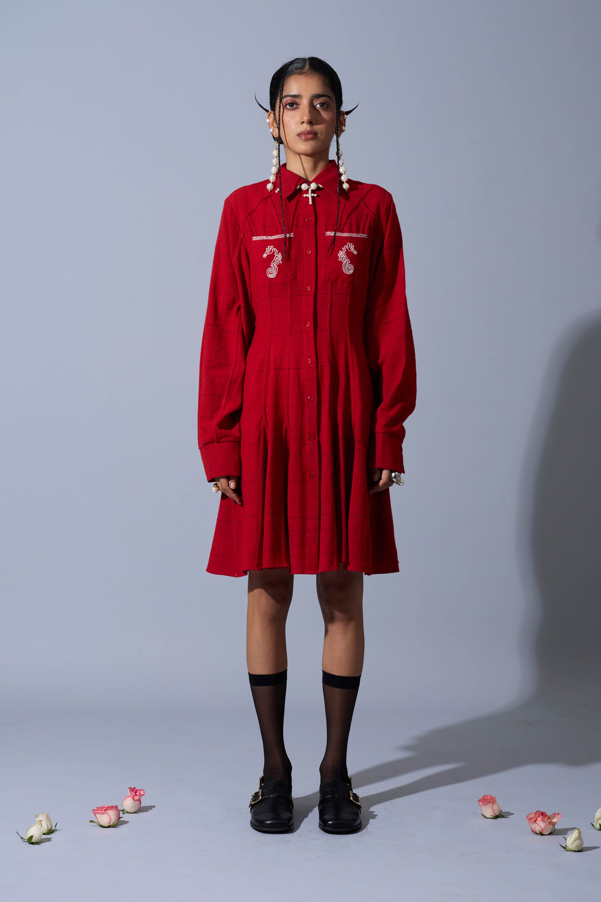 A handwoven linen dress with an A-line silhouette, panels with tapework detailing, godet insertions, and hand-embroidered seahorse details on the pockets.