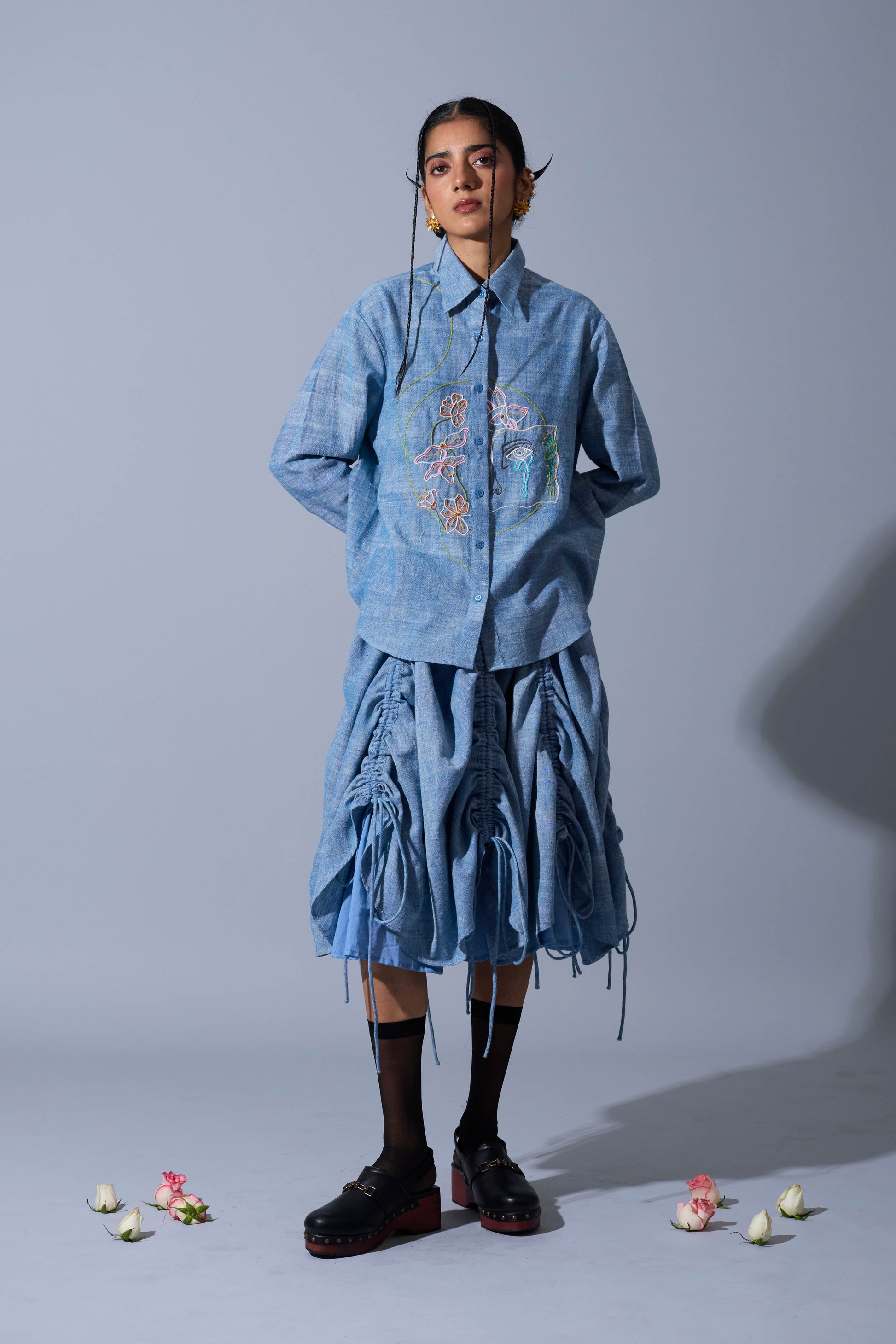 An asymmetrical skirt in handwoven linen with multiple vertical gathered panels all around the flare.