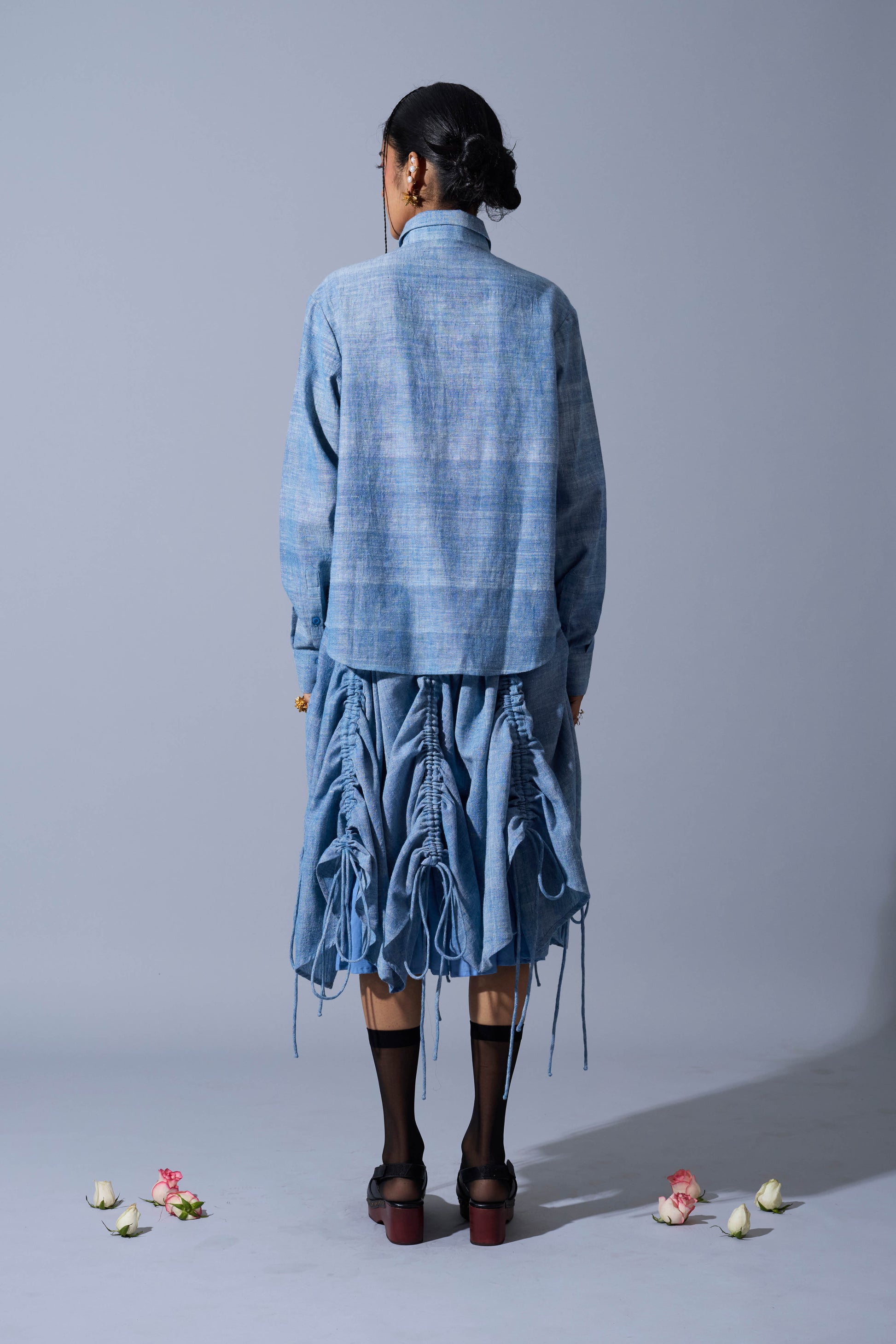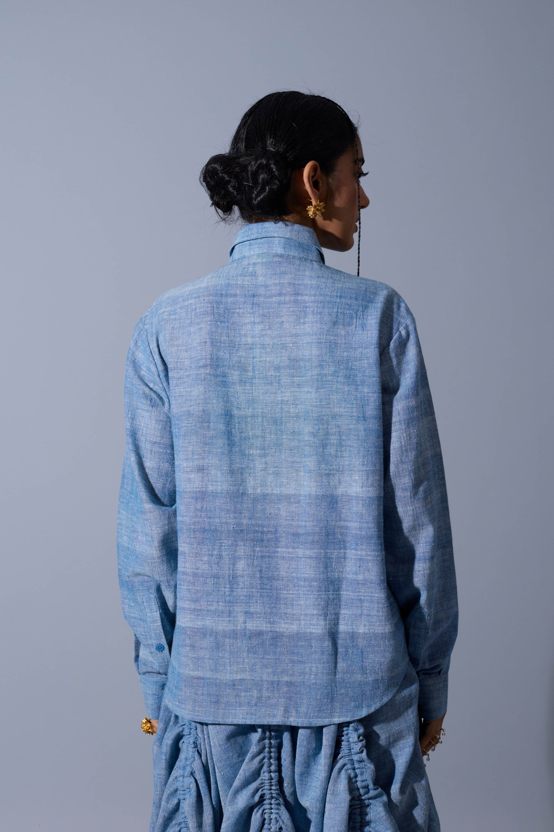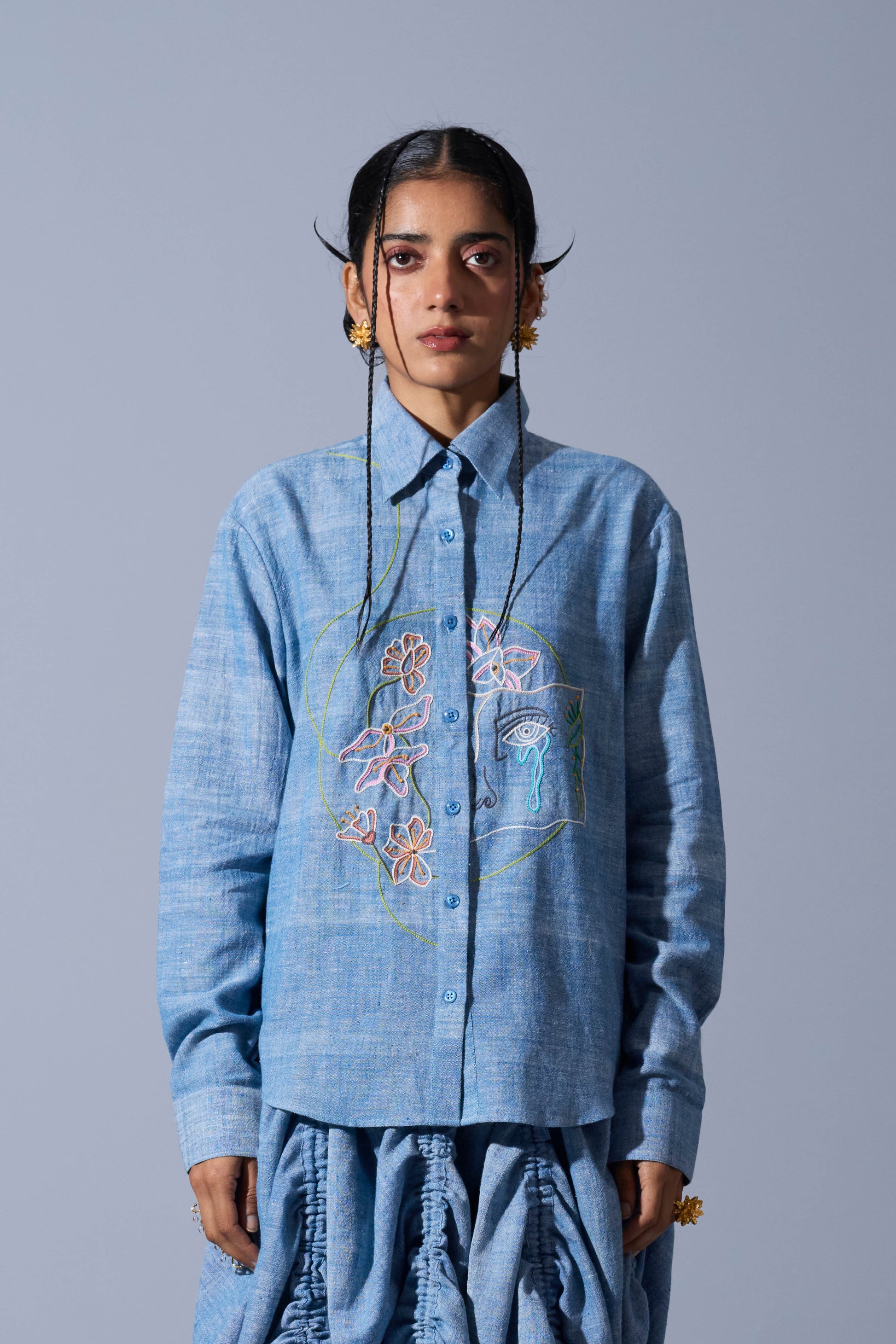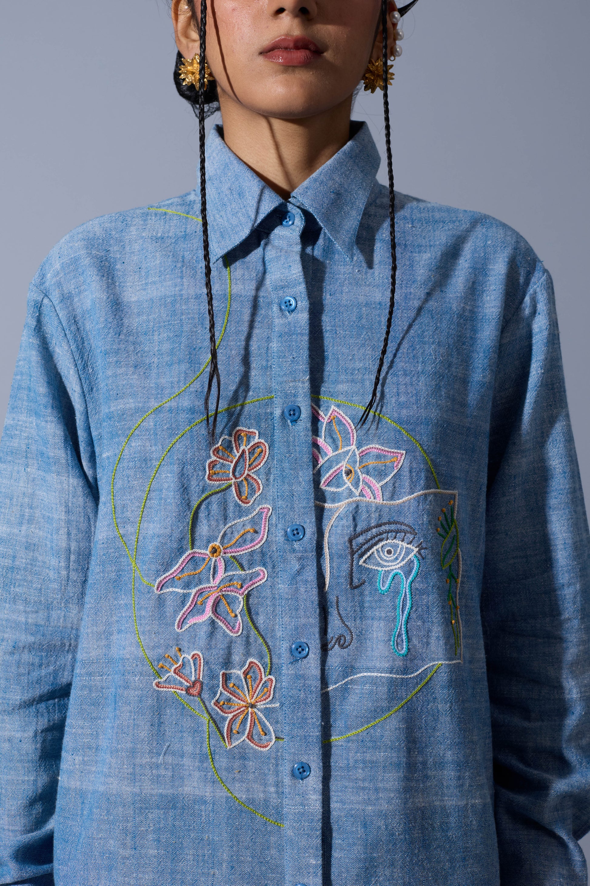 A handwoven linen shirt featuring QUOD's signature "Sad Boyfriend" embroidery at the front.