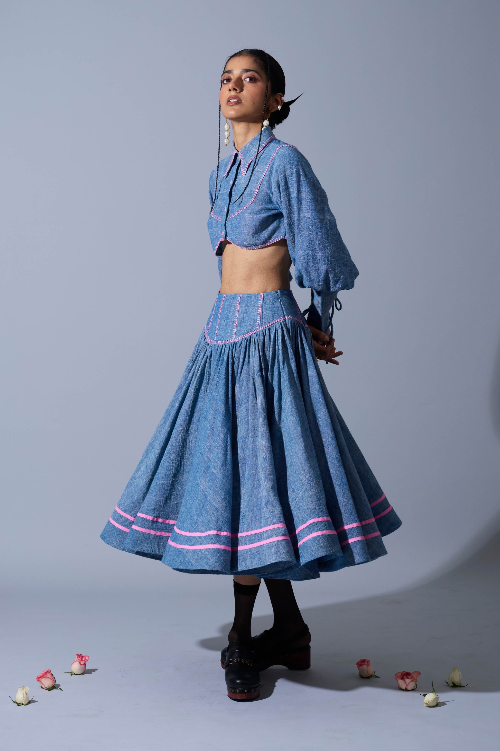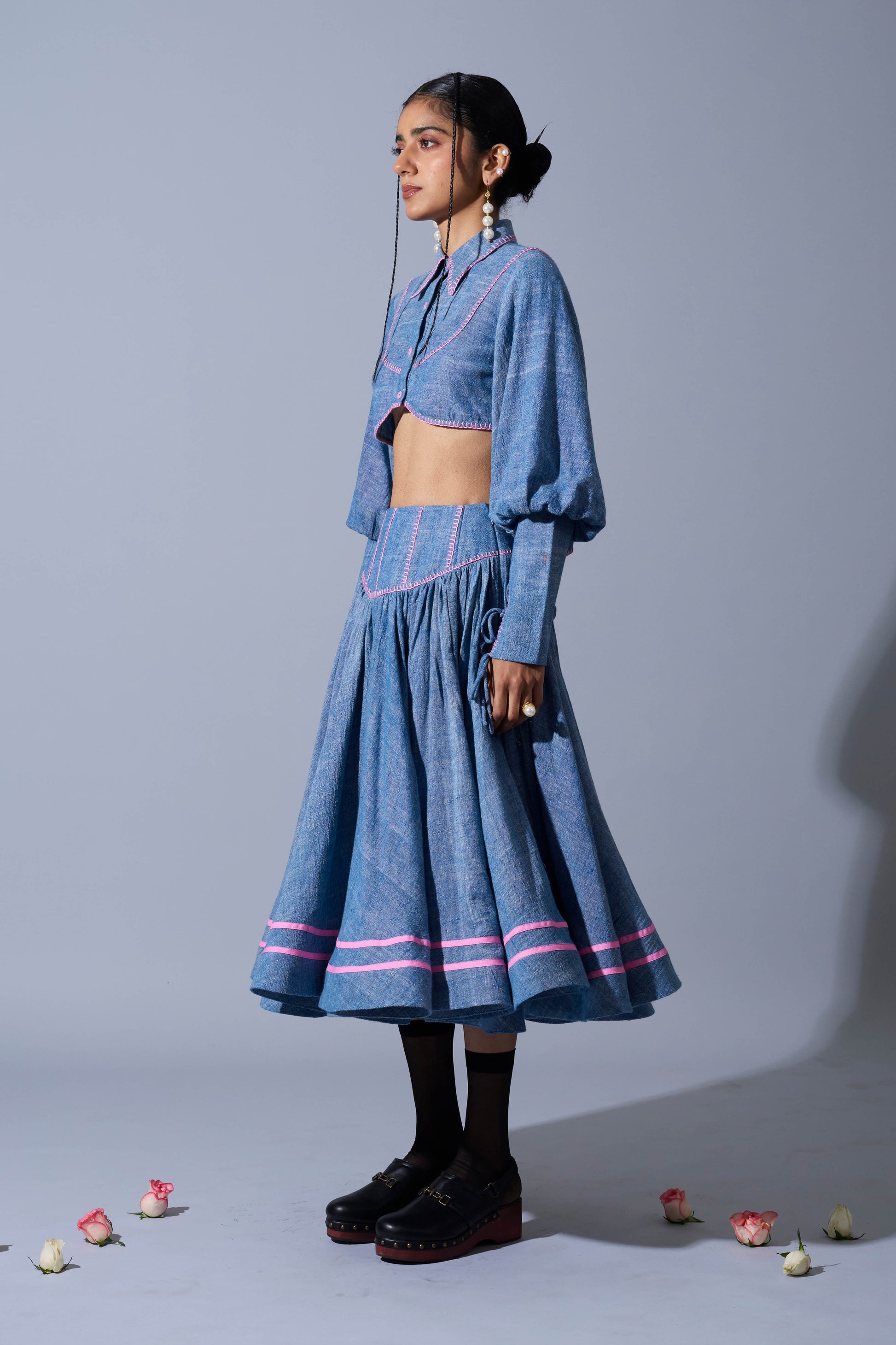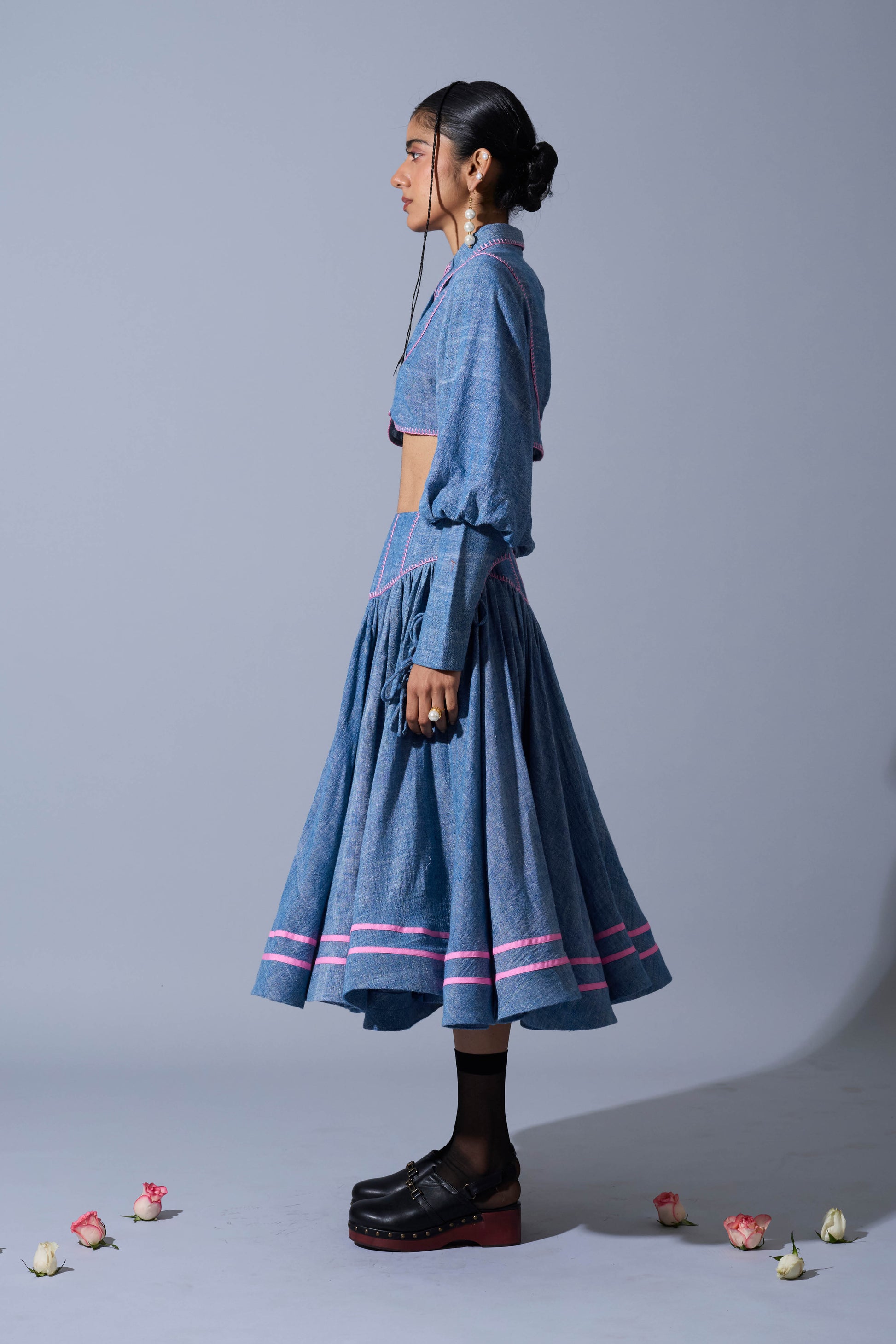 A circular flare skirt in handwoven linen featuring princess panelled waist-band with hand embroidery detailing in contrast and horse-hair hem with tapework detailing.